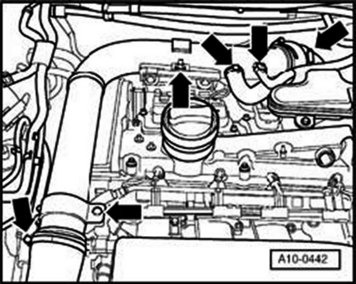 - Disconnect bottom coolant hose at oil cooler (arrow) to drain off remaining coolant.