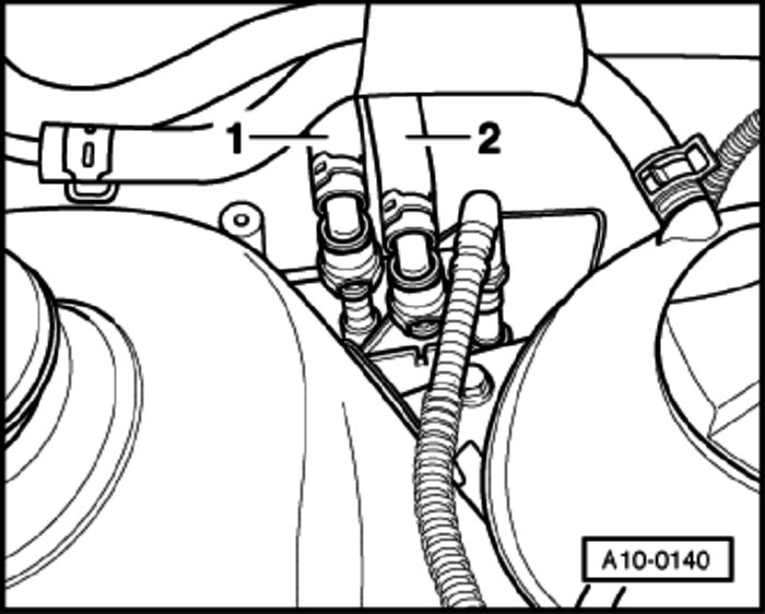 - Disconnect fuel supply line -1- and fuel return line -2- at the connection point by pressing the release tabs.