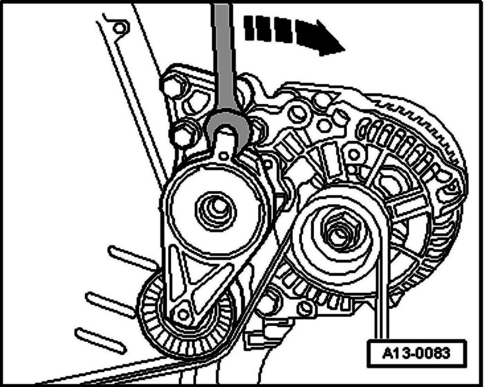 Note: Before removing the ribbed belt, mark the direction of rotation with chalk or a felt pen. If a used belt rotates in the wrong direction when refitted, this can result in breakage. When installing the belt, ensure it is correctly seated in the pulleys.