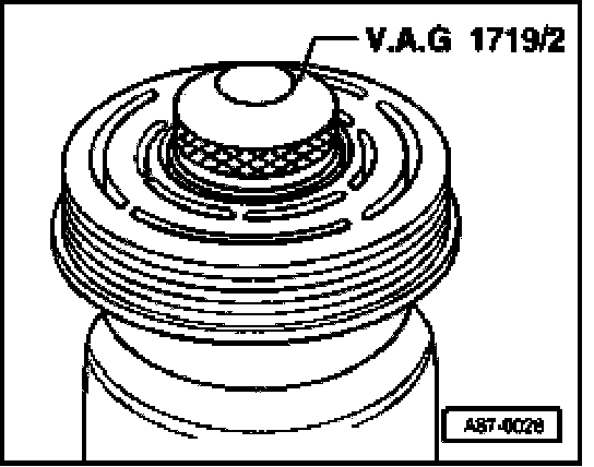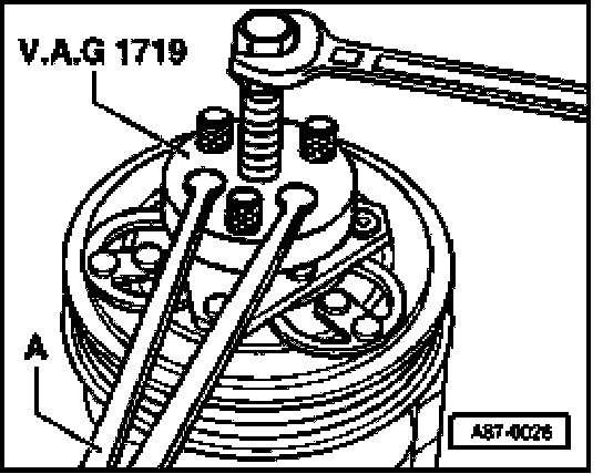 - Use commercially available two-pin wrench (illustrated -A-) and fixture from A/C clutch set VAG 1719 to counter-hold clutch plate