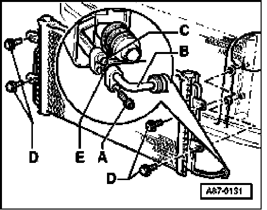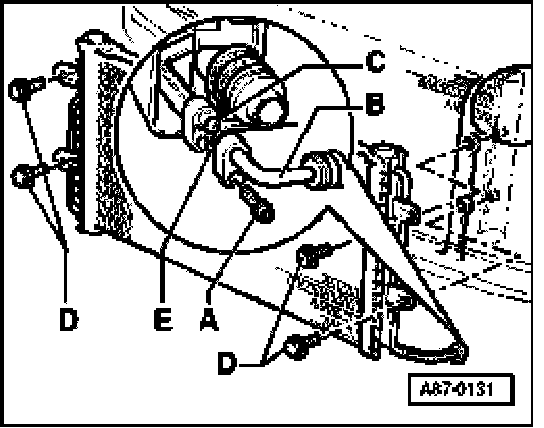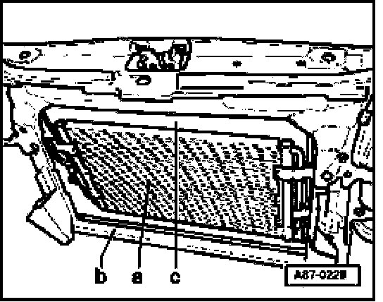 - Remove Condenser -a- from bottom (between lock carrier -b- and radiator -c-).