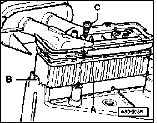 - When installing heater core, always secure it in the heater flap housing with two suitable screws -C- (e.g. self-tapping screws, 3.2 x 20 mm). This also applies even if the heat exchanger was originally only clipped in place.