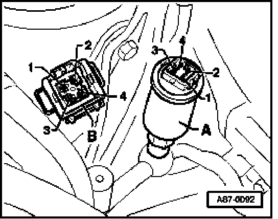 The high/low pressure switch (located between terminals -1- and -2-) disengages A/C clutch -N25- (via A/C control head -E87-) when there are excessively high or low refrigerant system pressures.