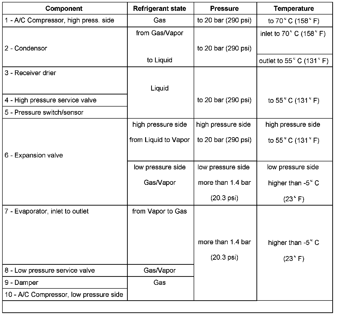 - At 20 degree C (68 degree F) with engine not running, refrigerant system pressure equalizes to approx. 4.7 bar (68.2 psi).