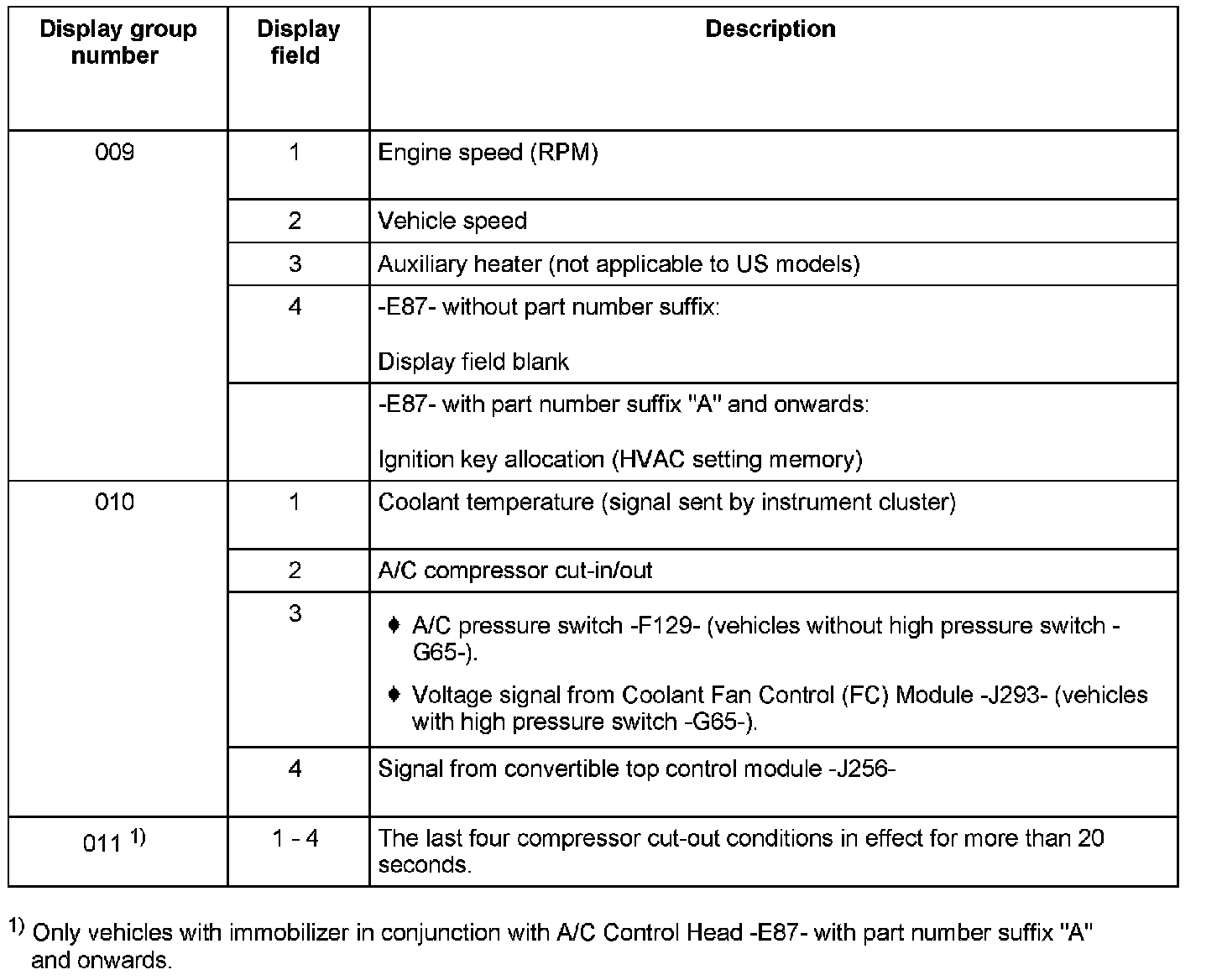 - A/C control heads -E87- with part numbers without index letter have 10 measuring value blocks (display groups), each showing 4 measuring values (display fields).