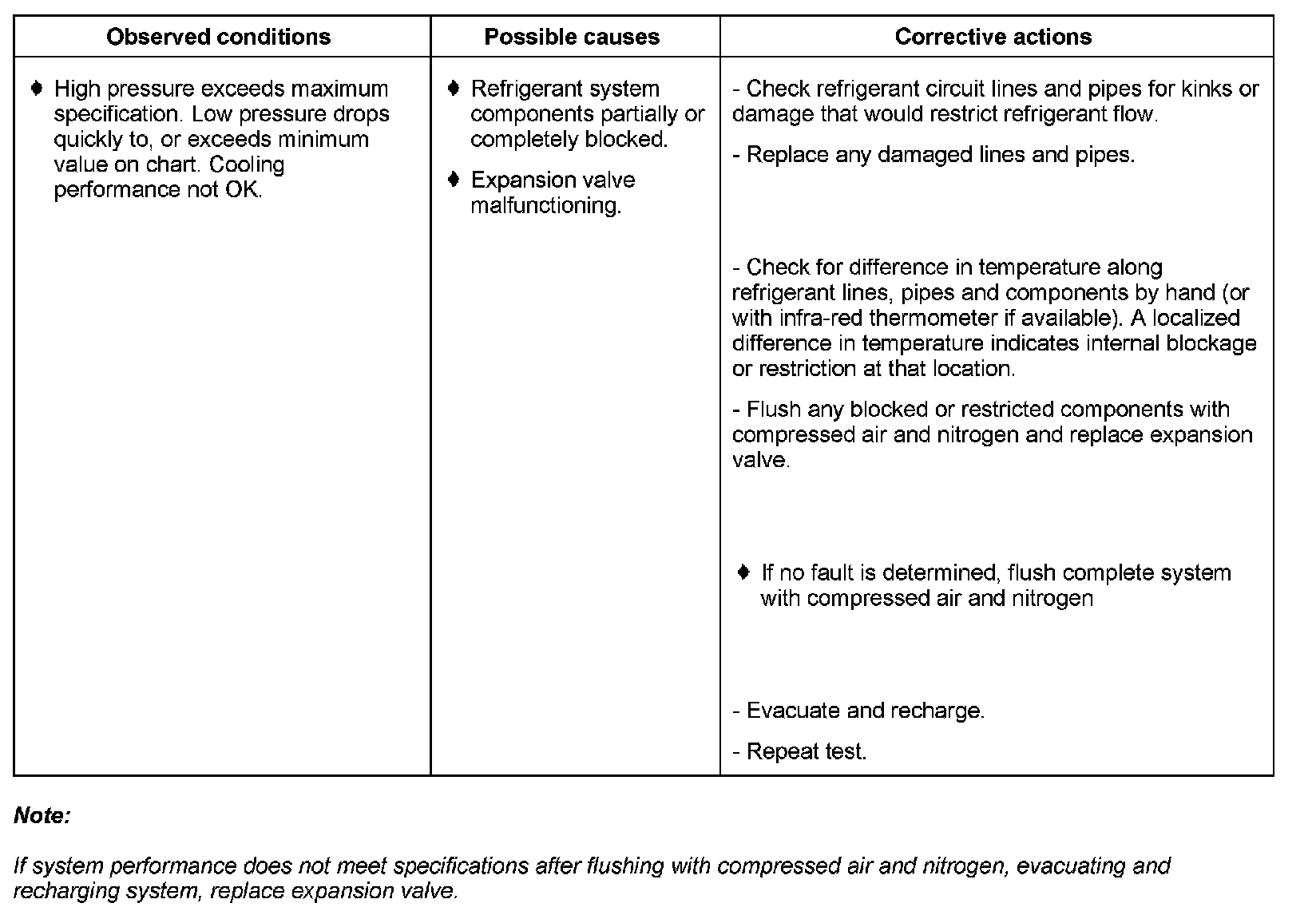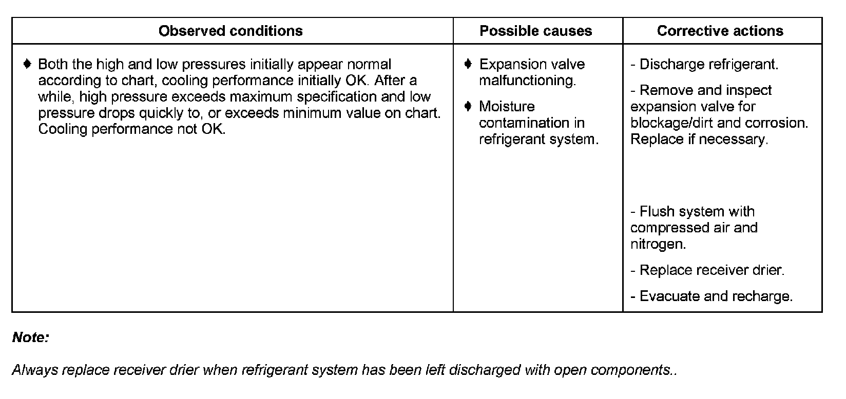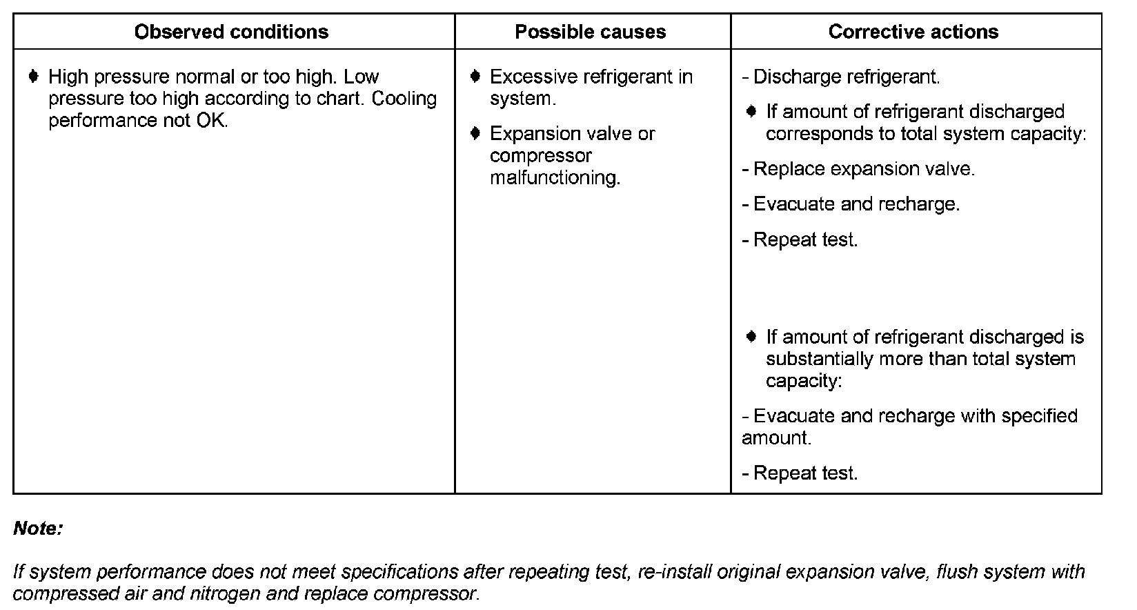 If A/C refrigerant system pressure corresponds to or is higher than pressure specified on chart (vehicles with expansion valve and receiver drier):