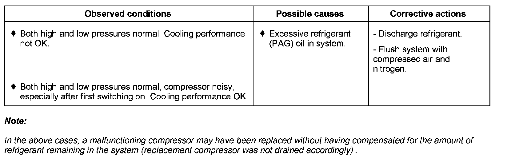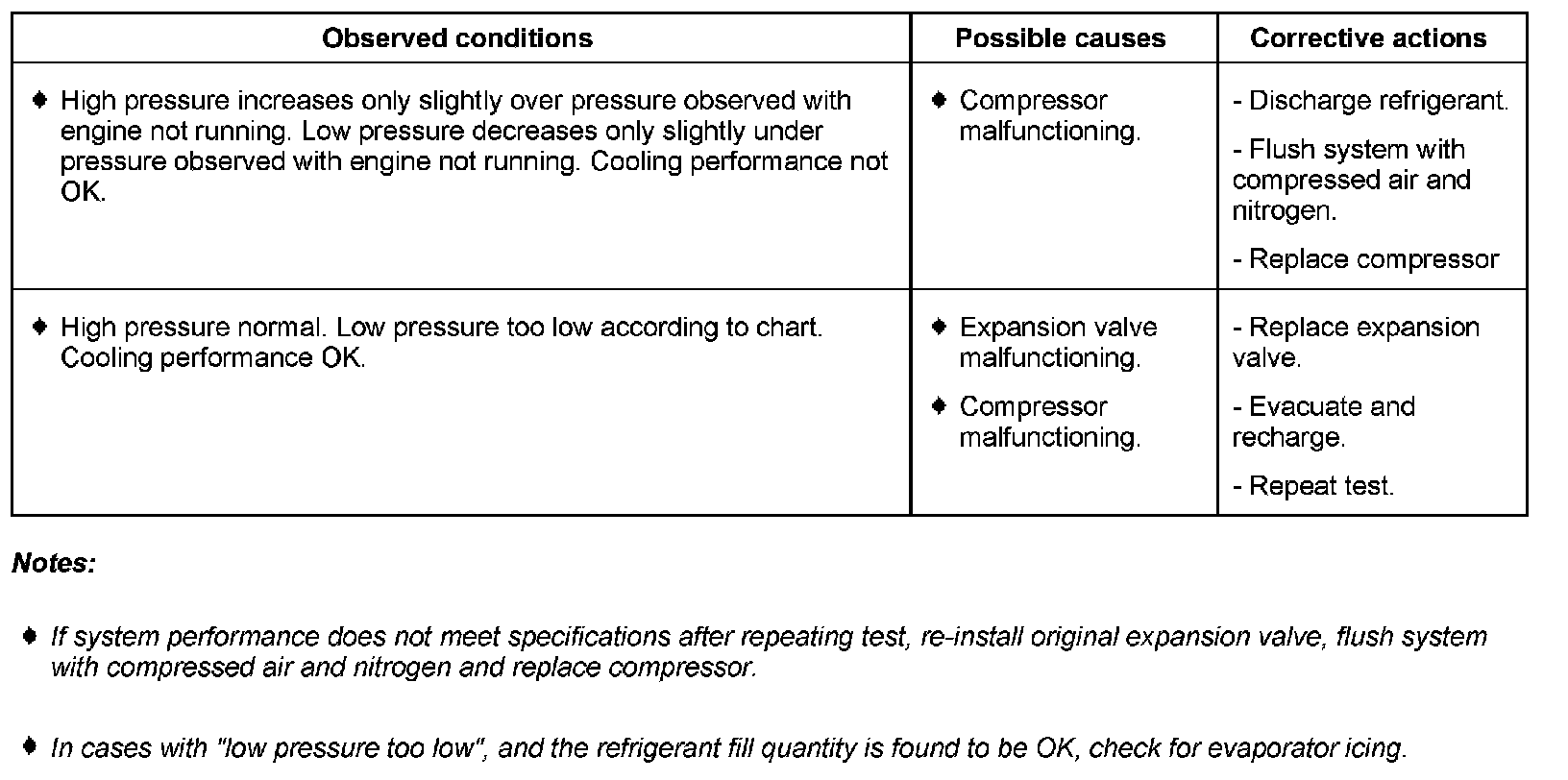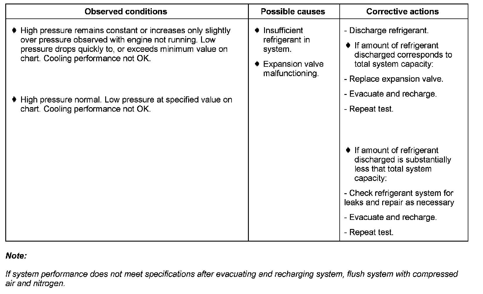 If A/C refrigerant system pressure corresponds to or is higher than pressure specified on chart (vehicles with expansion valve and receiver drier):