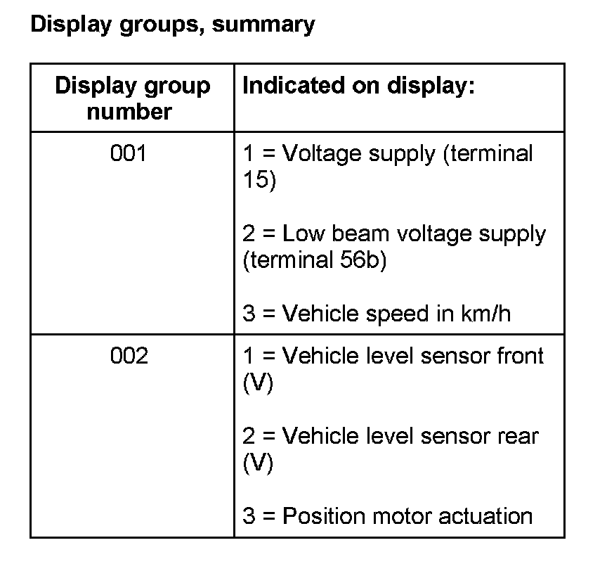 Use this function to observe various automatic vertical headlight level inputs and stored data.