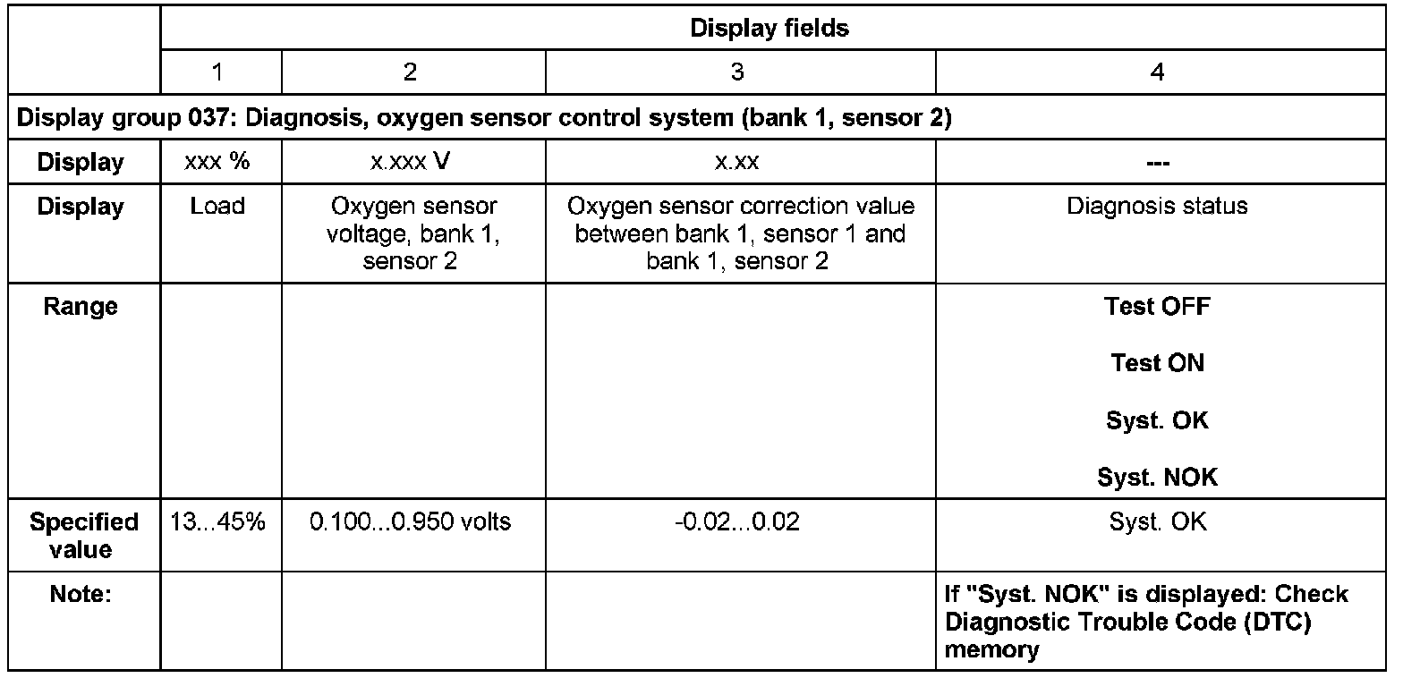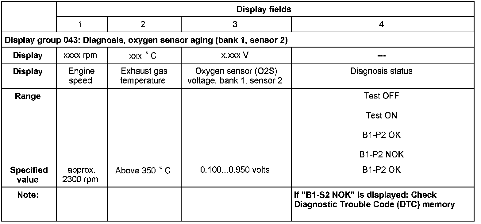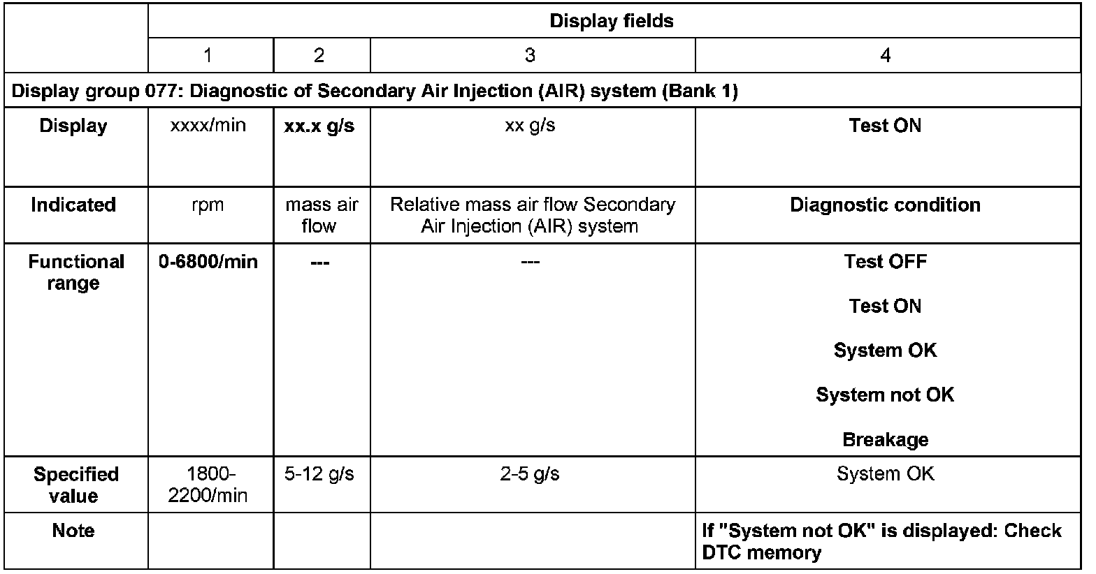 - If during the test the value in display field 4 changes from "Test ON" to "Test OFF" and "Breakage"(for example, when leaving the rpm range) and it does not return to "Test ON", turn the ignition off and back on; restart the "Secondary Air Injection (AIR) system" diagnosis.