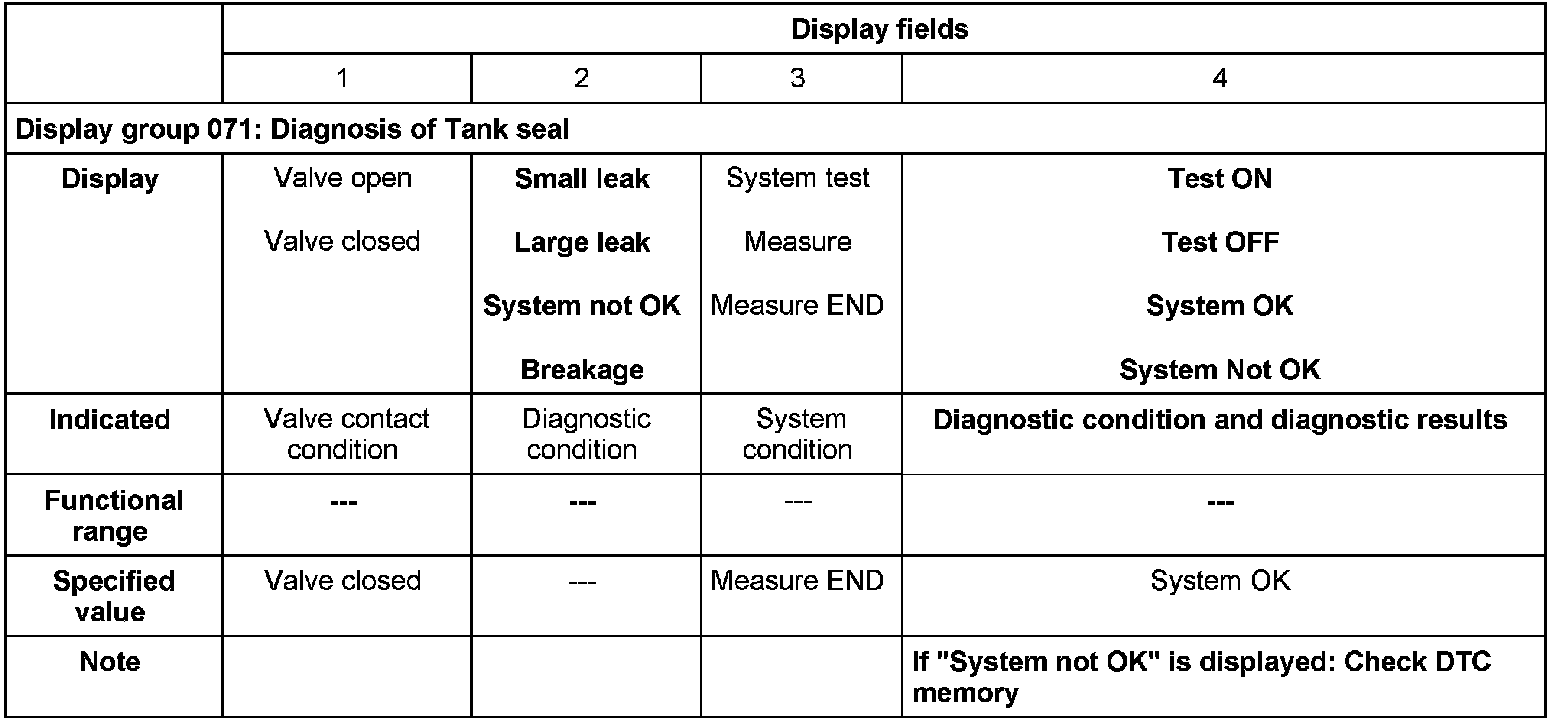 - If during the test the value in display field 4 changes from "Test ON" to "Test OFF" and "Breakage" is displayed in display field 2, restart the "Tank Seal Diagnostic".