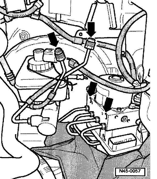 - Unscrew brake lines from brake master cylinder to hydraulic unit (arrows), and protect against dirt with caps from repair set 1 HO 698 311 A.