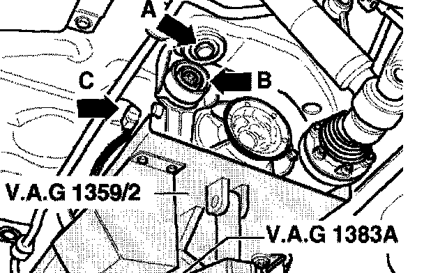 - Place transmission jack VAG1383 A with universal mounting V.A.G 1359/2 under final drive only and support final drive.
