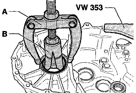 - Pull tapered roller bearing outer race from transmission housing. A - Support, i.e. Kukko 22/2 B - Puller 46...58 mm, i.e. Kukko 21/7.