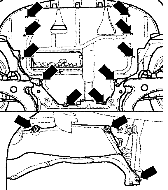 - Screw in engine/transmission securing bolts accessible from below. Tightening torque.