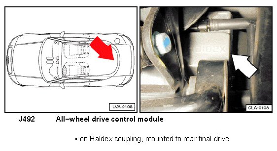 The Haldex clutch pump (arrow) is located at rear final drive, in front right area, below the control module.