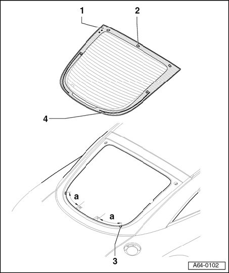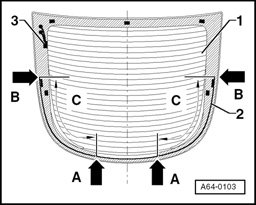 - Starting at arrow - A - and working upward, stick stopper profile onto rear window - 1 - at edge of conductor strip.