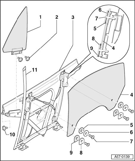 - Remove Torx bolts - 7 -, pull door window toward the rear out of guide rail and remove.