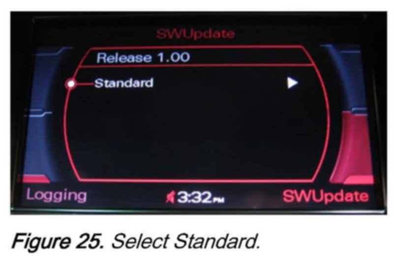 2. Wait 30-60 seconds until the MMI system recognizes the CD. Then access the red update menu (press and hold SETUP and RETURN buttons) and select the function SW Update with the lower right soft button.