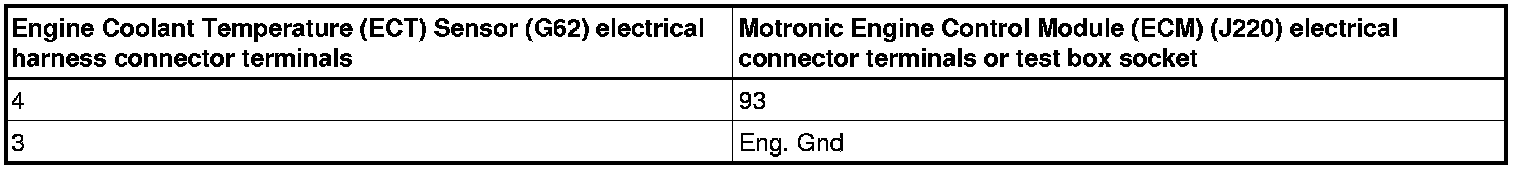 - Using a Multimeter, check the Engine Coolant Temperature (ECT) Sensor ( G62) electrical harness connector terminals to the Motronic Engine Control Module (ECM) (J220) electrical harness connector terminals for resistance.
