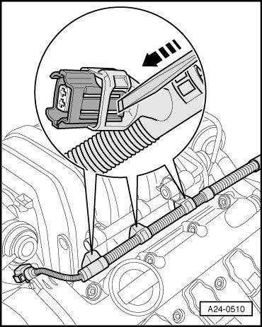 - Disconnect electrical connectors to all fuel injectors by releasing connectors at underside - arrow -.
