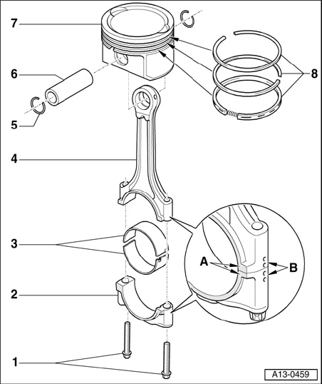 ^ Observe when installing bearing cap: Tabs at contact surfaces at face of connecting rod must be aligned -A-