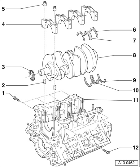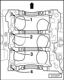 Application of bearing shells to crankshaft is marked with a letter sequence at the crankshaft flank. The first digit, "1" (arrow) identifies the color coding for bearing 1.