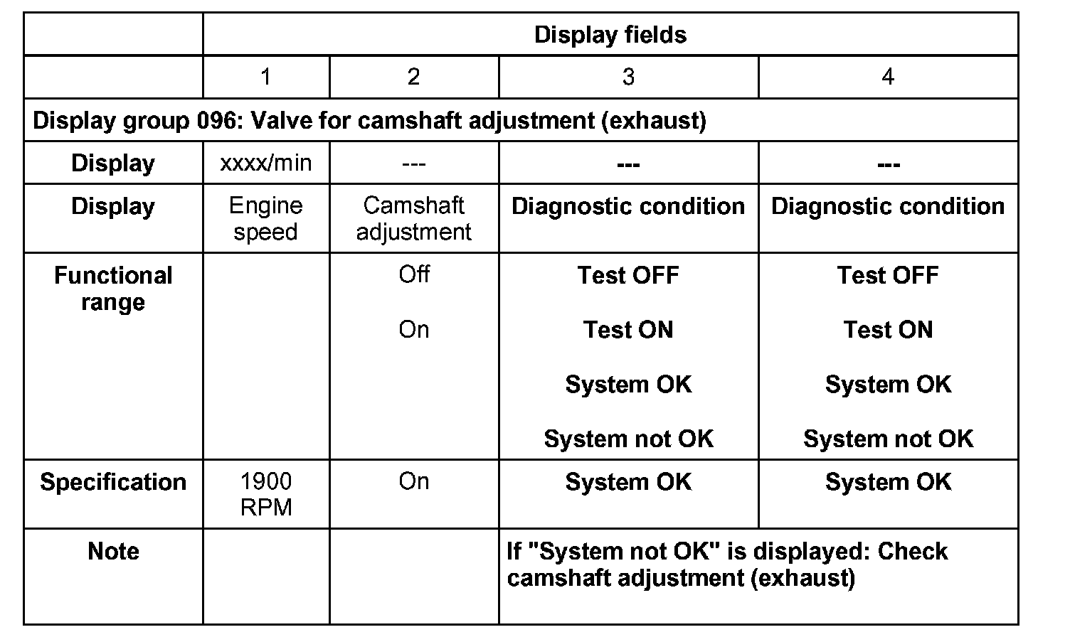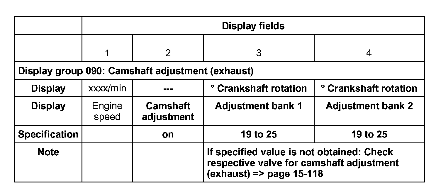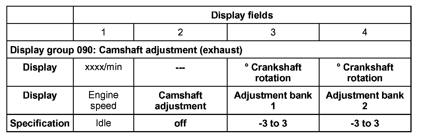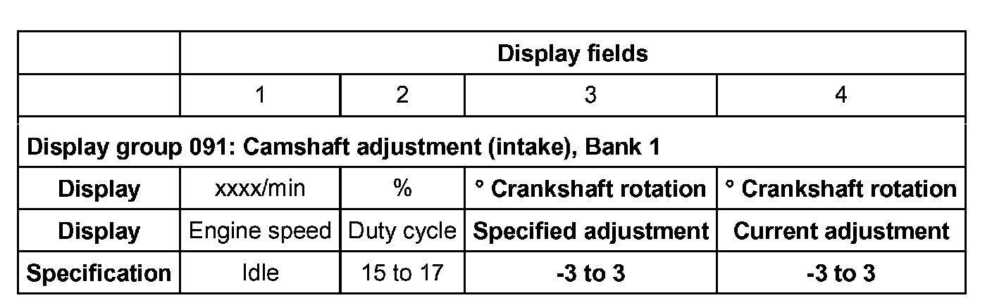 Note: If display field indicates a value between 3.0 ° crankshaft rotation and 19.0 ° crankshaft rotation during a road test, the electrical valve for camshaft adjustment is correctly switching the oil pressure to mechanical camshaft adjuster, but the mechanical camshaft adjuster cannot reach its end position (e.g. due to difficulty of movement).
