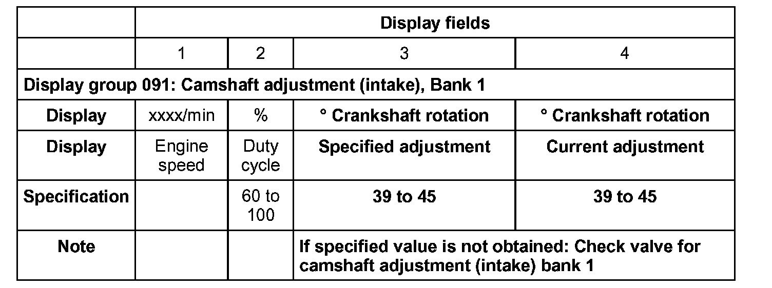 Note: If display field only indicates a value between 3.0 ° crankshaft rotation and 39.0 ° crankshaft rotation during a road test, the electrical valve for camshaft adjustment is correctly switching the oil pressure to mechanical camshaft adjuster, but the mechanical camshaft adjuster cannot reach its end position (e.g. due to difficulty of movement).
