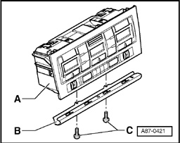 - Remove bolts - C -, slide trim panel - B - to right and remove it from operating and display module, Climatronic Control Module J255 - A -.