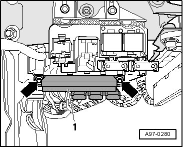 - Remove nuts - arrows - and remove Vehicle Electrical System Control Module (J519) - item 1 -.
