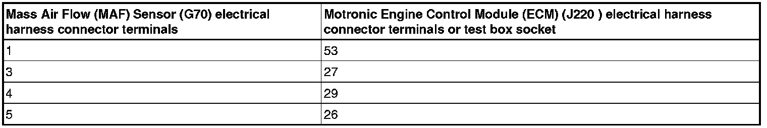 - Using a multimeter, check the Mass Air Flow (MAF) Sensor (G70) electrical harness connector terminals to the Motronic Engine Control Module (ECM) ( J220) electrical harness connector terminals for resistance.