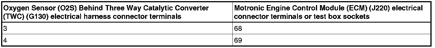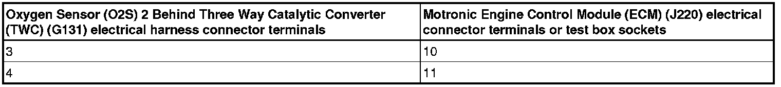- Using a Multimeter, check the Oxygen Sensor (O2S) Behind Three Way Catalytic Converter (TWC) ( G130) electrical harness connector terminals to the Motronic Engine Control Module (ECM) (J220) electrical harness connector terminals for resistance.