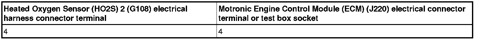 - Using a multimeter, check the Heated Oxygen Sensor (HO2S) 2 (G108) electrical harness connector to the Motronic Engine Control Module (ECM) (J220) electrical harness connector for resistance.