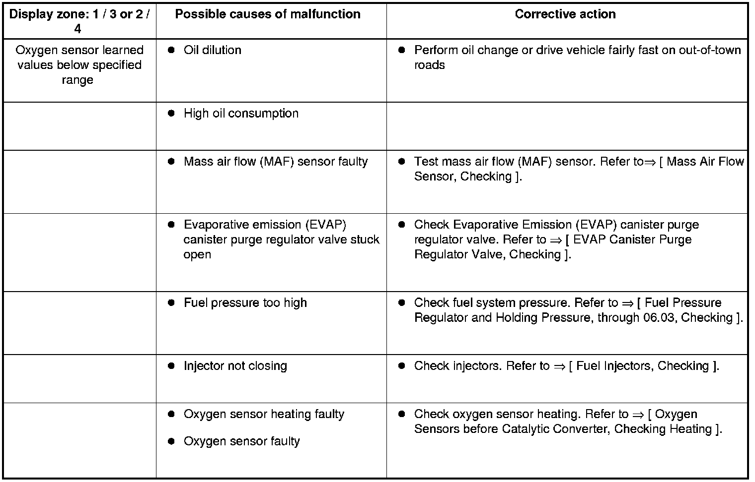 - Check oxygen sensor before catalytic converter for aging. Refer to => [ Oxygen Sensors before Catalytic Converter, Checking Aging ] Oxygen Sensors Before Catalytic Converter, Checking Aging.