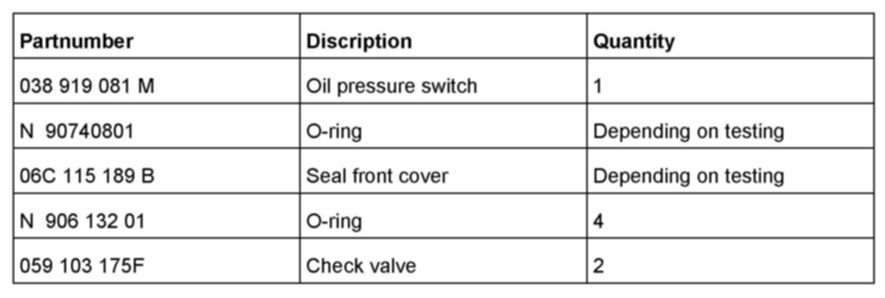 5. If the engine oil pressure still does not meet the specifications shown above, check for possible oil leaks from the engine (e.g. around the camshaft adjuster units) that could cause the oil pressure to drop below the specified values.