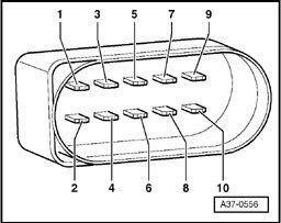 - Connect multimeter between terminals of 10-pin harness connector and sockets of test box e.g. V.A.G 1598/20 for resistance measurement as indicated in the following table.