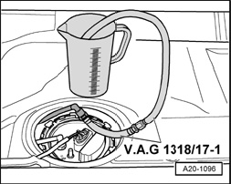 - Connect adapter V.A.G 1318/17-1 to disconnected fuel line and hold it in a measuring container.
