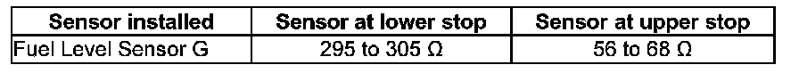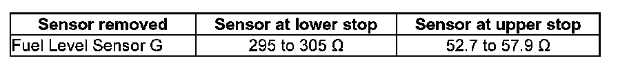 - With fuel level sensor G removed, the following values are obtained because of the greater deflection of the floater arm:
