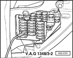 - Connect e.g. VAG1348/3A remote control connection using adapter cables from VAG1348/3-2 at right terminal of socket from fuse S228 (position 28).