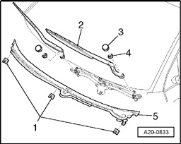 - Disconnect securing clips -1- and remove cowl grill -5-.