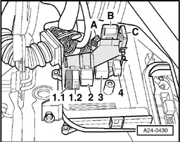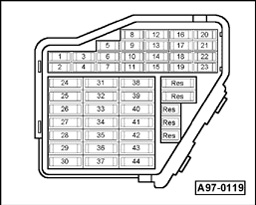 - Check wire connection from B+ (terminal 30) via Fuse for secondary air pump -S130- to Secondary Air Injection (AIR) Pump Relay -J299- (in relay and fuse carrier in E-Box, plenum chamber, position 3) for open circuit according to wiring diagram.
