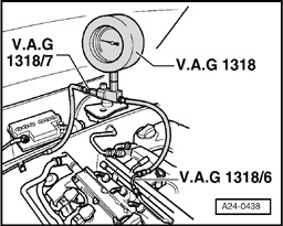 - Connect VAG1318 pressure gauge in supply line using adapters 1318/6 and 1318/7.