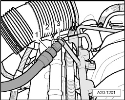 - Remove fuel hose from connection on fuel rail line. To do so, counterhold at each hex head -1- and -3- using an open-end wrench and remove union nut -2-.