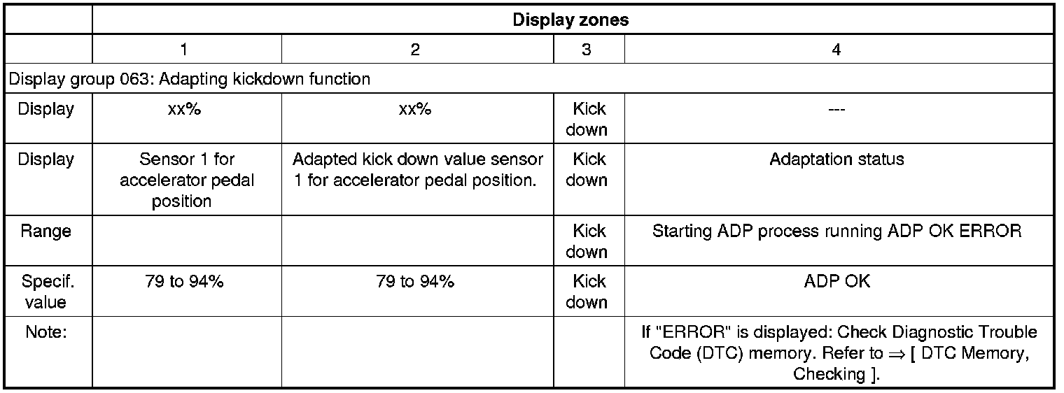 • If "ERROR" can be displayed, if e.g. accelerator pedal is not pressed when instructed by tester, or if accelerator pedal was released while adaptation was already running but process was not yet complete. In both cases it is necessary to exit the "Basic setting" mode and restart the adaptation process again. Refer to => [ Kickdown Function, Adapting ] Testing and Inspection.
