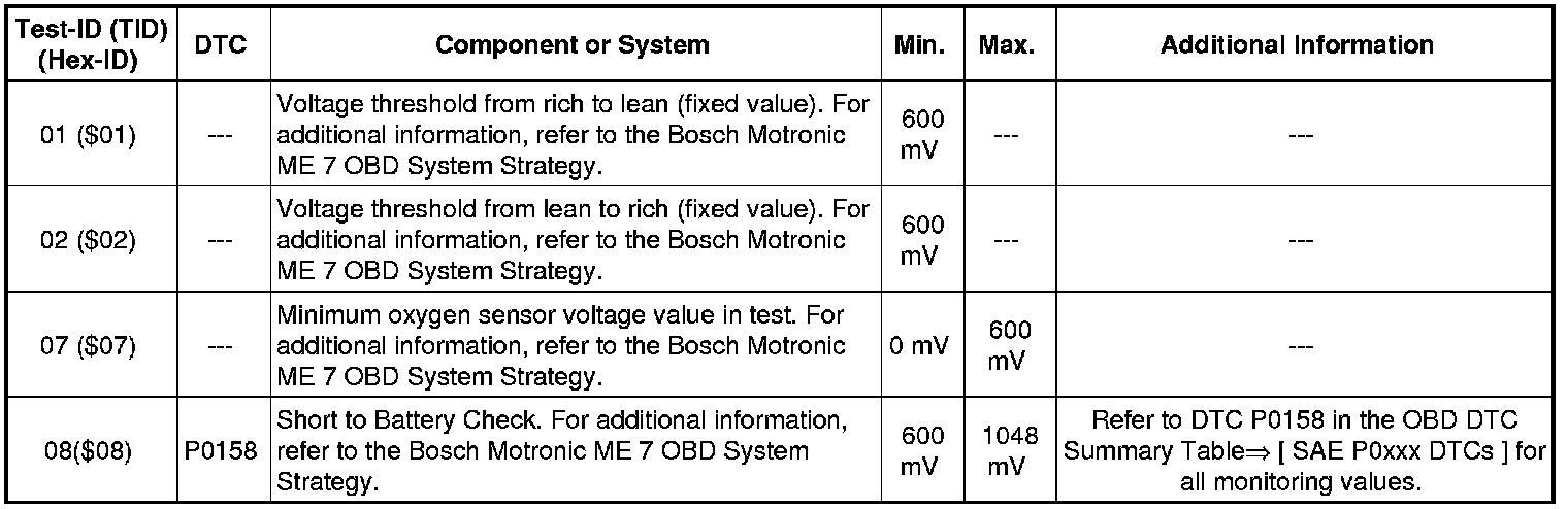 - If any component or system fails to meet the specified values, refer to => [ Diagnostic Mode 03 - Read DTC Memory ] Diagnostic Mode 03 - Read DTC Memory to check for stored DTC's or the corresponding diagnostic repair procedure.