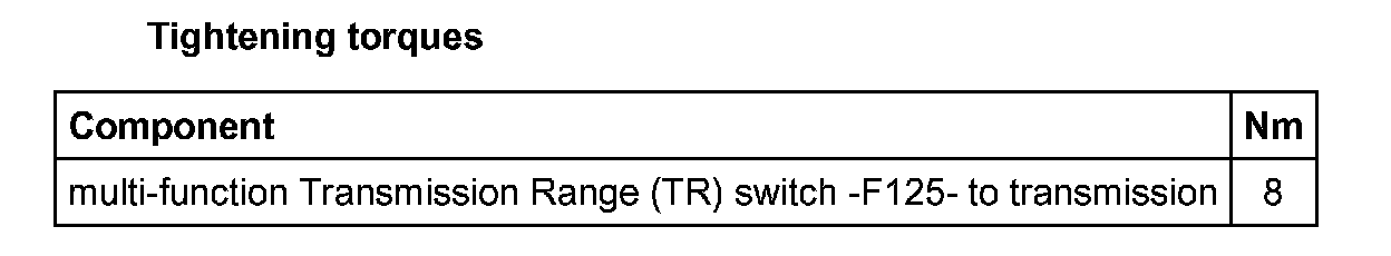 - Unbolt Multi-Function Transmission Range (TR) Switch -F125- from transmission and pull off from shift rod.