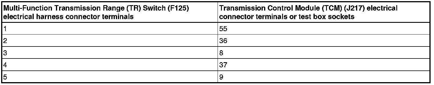 - Using a multimeter, check the Multi-Function Transmission Range (TR) Switch (F125) electrical harness connector terminals to the Transmission Control Module (TCM) (J217) electrical harness connector terminals for an open circuit.