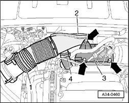 - Remove hose -4- of crankshaft housing ventilation from air duct -2-.