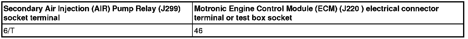 - Using a Multimeter, check the Secondary Air Injection (AIR) Pump Relay (J299) socket 6/T to the Motronic Engine Control Module (ECM) (J220) electrical harness connector terminal 46 for resistance.