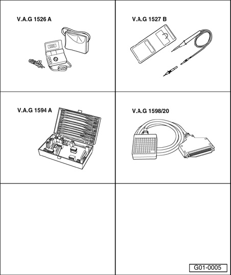 ^ For testing, use Multimeter V.A.G 1526 A or Vehicle Diagnosis, Measurement and Information System VAS 5051. The charts contain the specific measurement methods which have to be set up before the corresponding measurements.
